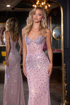 A sweetheart-shaped fitted gown with thin straps, visible boning, ruching at the hips, and adorned with stones. This dress has no stretch.