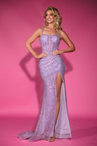 This fitted gown features a drop V waist and a split. This dress has no stretch.