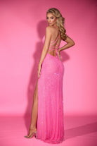 This fitted gown features a keyhole bodice and a high slit. This dress has medium stretch.