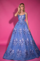 A ballgown made of glitter lace with a scoop-shaped bust and thin straps. This dress has no stretch.