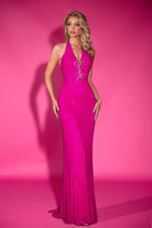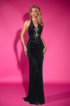 A halter neck dress adorned with hot stones, featuring a keyhole in the bodice held together by two beaded bows. This dress has high stretch.