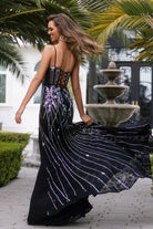 A fitted gown with thin straps and a deep V-neck bodice. This completely encrusted dress features a thigh-high slit. This dress has no stretch.