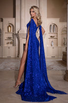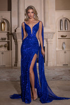 A fitted gown with a V-neckline and fabric draping on the shoulder straps, along with a high slit. This dress features sheer sides and lacks stretch.