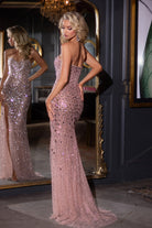 Sweetheart-shaped bodice, fitted floor-length gown with a slit, adorned with beads and sequins. This dress has no stretch.