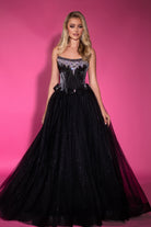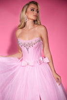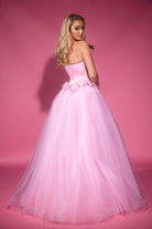 A strapless ballgown featuring beading along the neckline, defined boning, and decorative bows placed throughout the dress, complemented by a tulle skirt. This dress has no stretch.