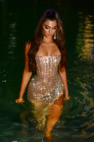 A strapless couture gown, embellished with intricate beading, featuring a defined waist and a side slit. ?This dress has no stretch.