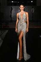 A sleek, fitted couture gown adorned with intricate beading and a striking high slit. ?This dress has no stretch.