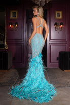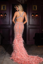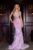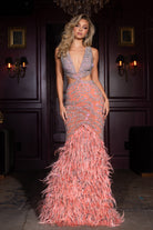 A couture beaded gown featuring a V-front, chic side cut-outs, and a featheRD hem. This dress has no stretch.