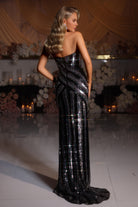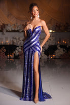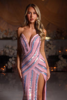 A strapless couture gown embellished with delicate beading, featuring a sweetheart-shaped bodice and a dramatic high slit. This dress has no stretch.