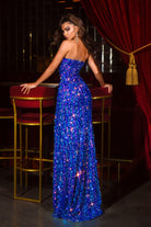 A strapless beaded couture gown showcasing a bold high slit. This dress has no stretch.
