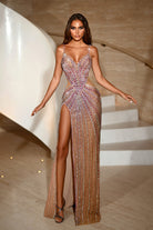 A sleek, fitted couture gown adorned with intricate beading and a striking high slit. ?This dress has no stretch.