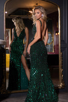 A sleek, fitted couture gown adorned with intricate beading and a striking high slit. ?This dress has no stretch.