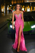 A strapless couture gown embellished with delicate beading, featuring a sweetheart-shaped bodice and a dramatic high slit. This dress has no stretch.