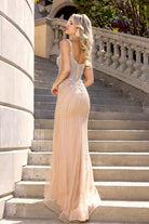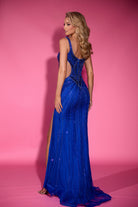A beaded gown featuring alluring side cut-outs and a high slit. This dress has no stretch.