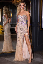 Strapless gown scatteRD with crysals and a high slit. This dress has no stretch.