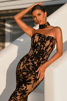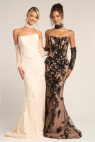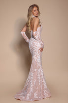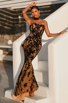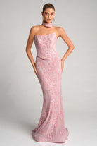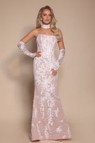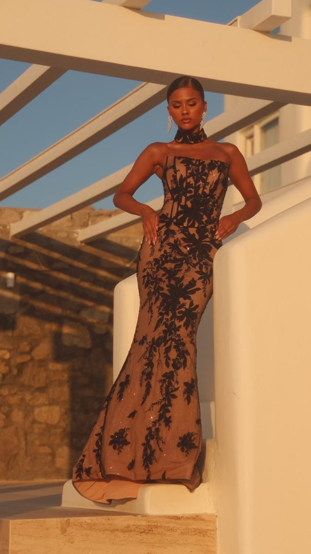 This strapless gown features a structured bodice with corset-inspired shaping that defines and flatters the figure. Delicate floral embroidery cascades down the silhouette, adding texture and dimension to the sleek sheath design. The floor-length skirt drapes beautifully, creating a graceful and elongated finish. PS26005 combines classic sophistication with modern glamour for an unforgettable look.