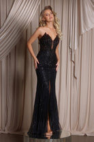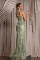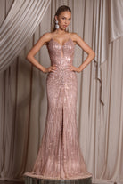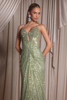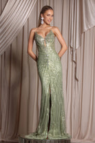 PS26012 is designed to shimmer from every angle, featuring a plunging neckline and sculpted bodice. Intricate bead embellishments trace the silhouette, adding radiant sparkle and dimension. A daring front slit brings a touch of allure and graceful movement, while the floor-length skirt flows beautifully for an elegant finish.