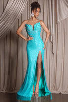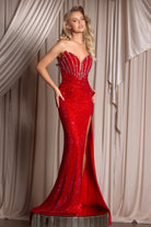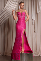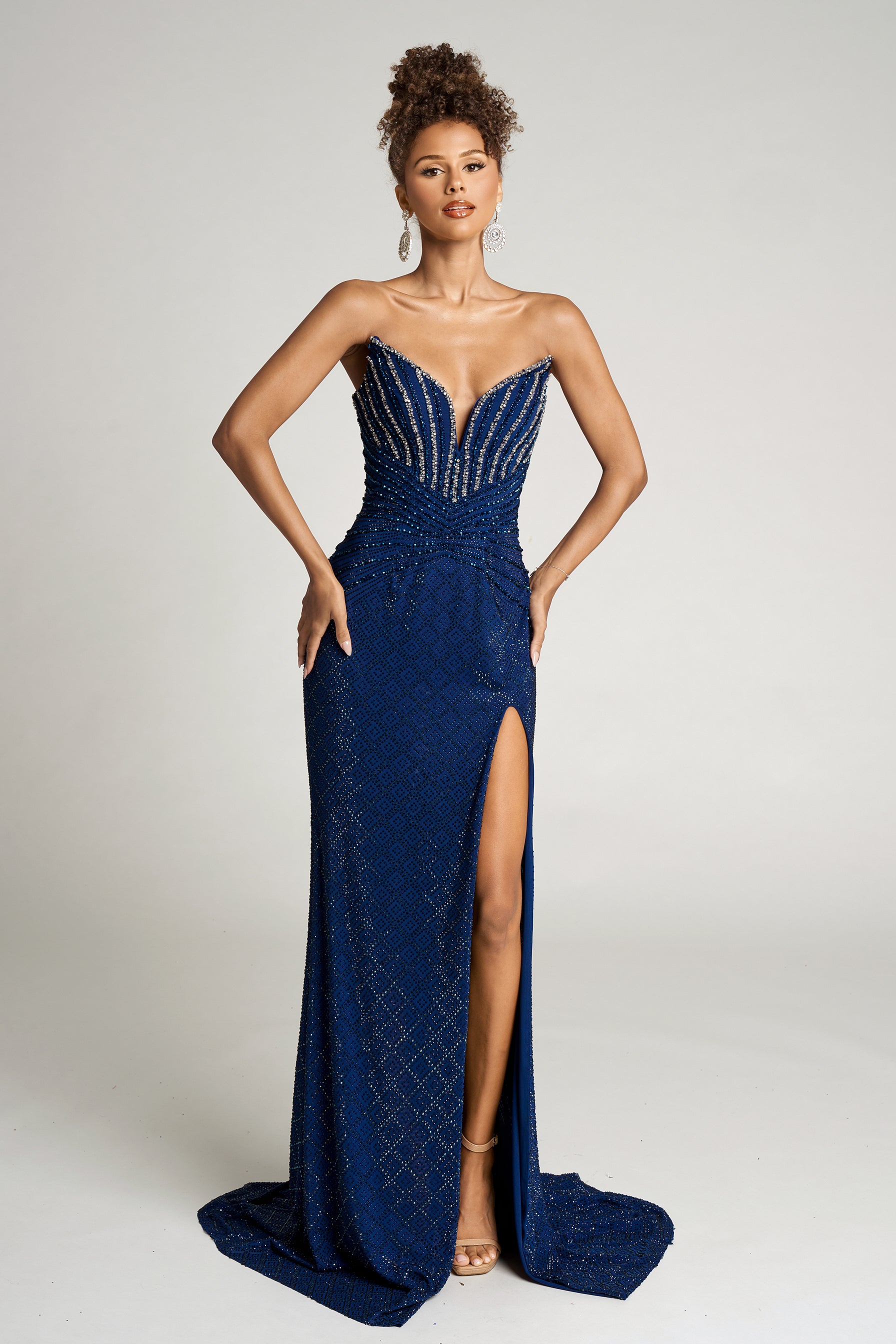 The strapless neckline features a daring illusion plunge, framed by intricate bead embellishments that radiate from the bodice in a sculpted, figure-enhancing pattern. The fitted silhouette is accentuated by delicate rouging at the waist, flowing seamlessly into a sleek skirt with a high front slit that reveals a hint of allure. Finished with a graceful sweep train, this gown captures the essence of red-carpet romance and unapologetic confidence.