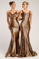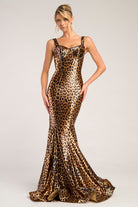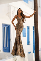 Fierce sophistication meets timeless allure in style PS26023, a gown designed for the woman who dares to stand out. The sculpted bodice features a sweetheart neckline and delicate straps, highlighting the shoulders and d?colletage with effortless poise. Crafted in a striking leopard print fabric, the design hugs every curve before flaring into a dramatic mermaid-style skirt that moves with captivating grace.?