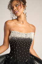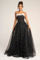 Style PS26034 delivers timeless grandeur through its exquisite craftsmanship and enchanting silhouette. The strapless bodice features a structured corset design embellished with delicate bead and pearl accents that gradually disperse into the voluminous tulle skirt. The full A-line skirt, layered with fine glitter tulle, offers ethereal movement and a captivating play of sparkle with every step. Designed to flatter and enchant, this gown combines architectural precision with soft romantic detail.