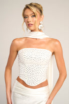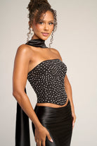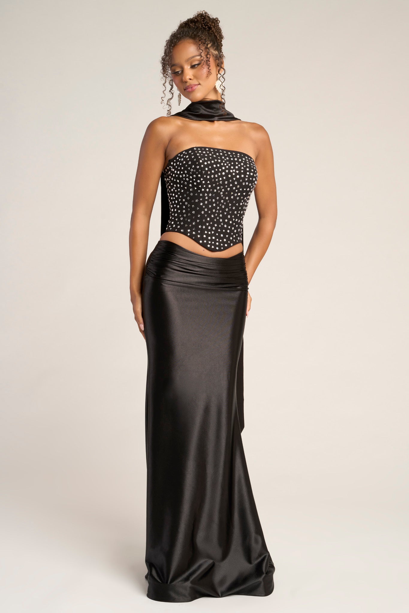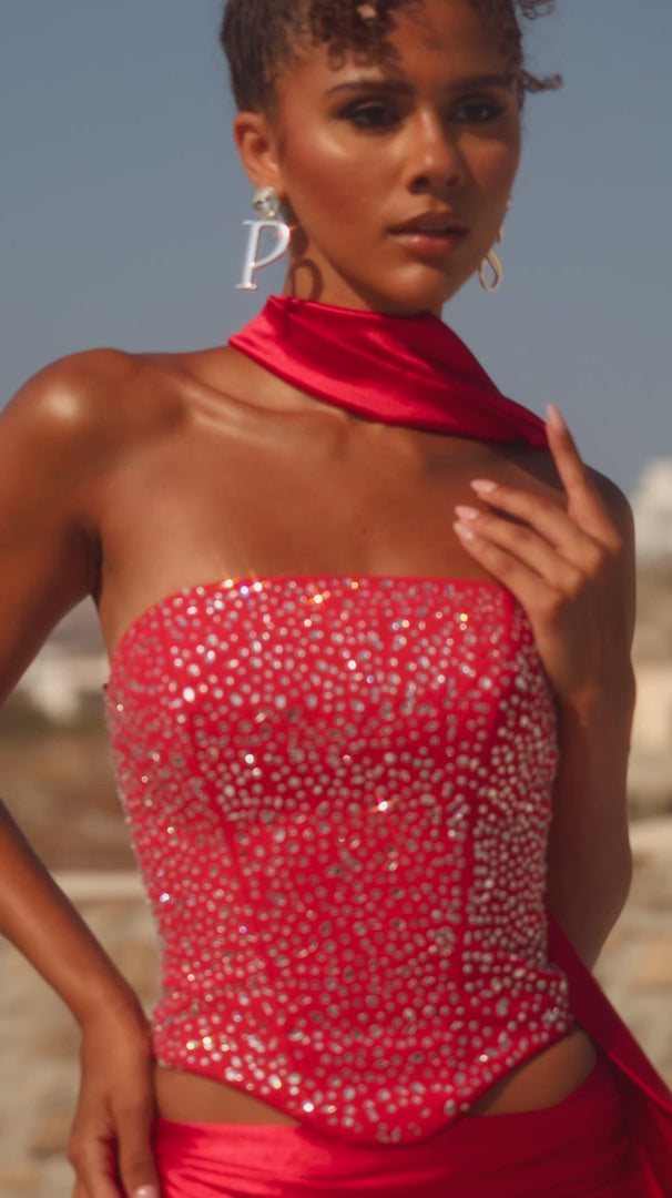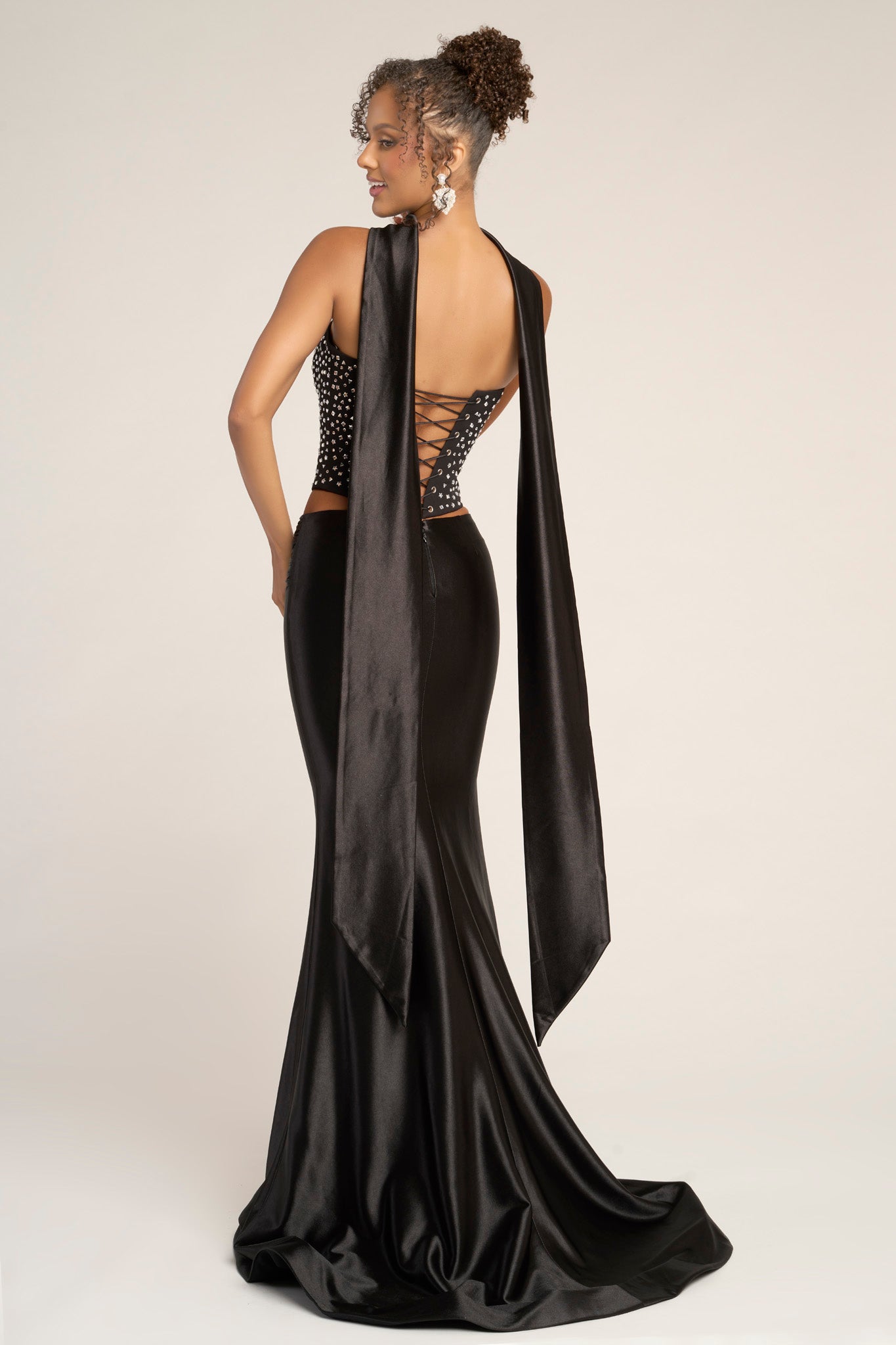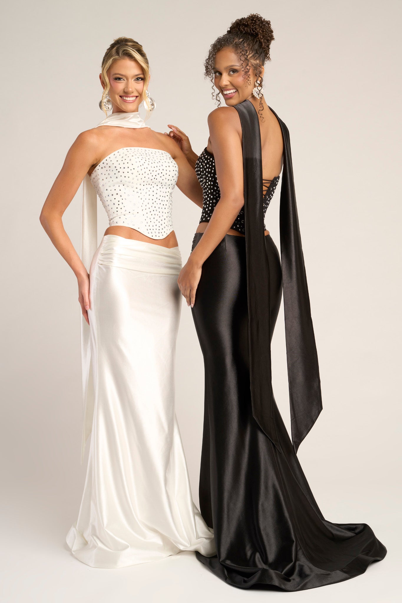 Style PS26042 redefines sleek sophistication through contemporary design and luxurious fabrication. This two-piece gown features a strapless bodice adorned with a constellation of hand-applied bead embellishments that beautifully contrasts with the smooth satin finish of the skirt. The structured corset construction accentuates the waistline, while the sleek, floor-length skirt glides effortlessly to the ground.