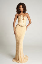 Style PS26054 features a strapless corset bodice, expertly structured with vertical boning to sculpt the figure and enhance posture. A statement bow accent at the bust adds a touch of dimension, contrasting beautifully with the gown?? sleek fitted skirt which is fully embellished with intricate beadwork arranged in soft, scalloped patterns that elongate the silhouette and shimmer gracefully in motion.?