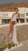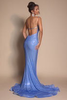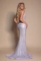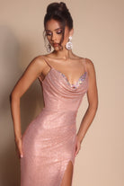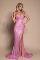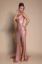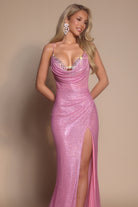 Style PS26068 features a delicate cowl neckline framed by fine shoulder straps. The bodice is expertly constructed with internal support, ensuring a smooth, contoured fit through the waist and hips. Crafted from a shimmering fabric, the design captures the light with every movement, creating a liquid-like effect that enhances its elegant flow. A thigh-high slit is balanced by a graceful train.