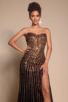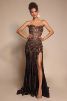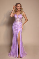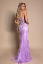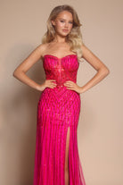Style PS26072 channels high-impact glamour with its sculpted form and intricate embellishment. The strapless bodice features a structured corset construction with internal boning. Linear beadwork radiates from the neckline through the hips in a striking geometric pattern, creating a visually elongated silhouette that celebrates the natural curves. A thigh-high slit introduces a modern edge to the gown?? classic column design, while the smooth fit-and-flare hem extends into a fluid train that moves with effortless grace.?
