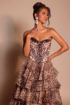 Style PS26098 exudes untamed glamour with a captivating balance of drama and sophistication. The strapless corset bodice features structured boning and intricate detailing that accentuates the waist, creating a beautifully defined silhouette. Cascading layers of tiered ruffles flow into a voluminous high-low skirt, adding depth and movement with every step. The daring thigh-high slit lends a modern, alluring edge to the otherwise romantic design. Perfect for statement-making entrances, this gown embodies confidence, femininity, and bold elegance ??a true showstopper for those unafraid to stand out.