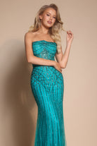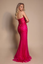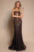 Style PS26130 radiates elegance and modern glamour with its sleek, strapless silhouette and masterful embellishment. The gown features a fitted bodice adorned with intricate linear beading that elongates the figure, complemented by an artistic lattice pattern that defines the waist and hips. Flowing into a soft mermaid hem, the design captures light with every movement, creating a luminous and statuesque effect.