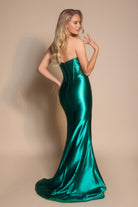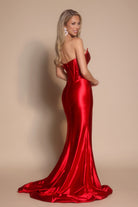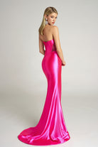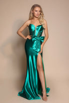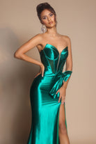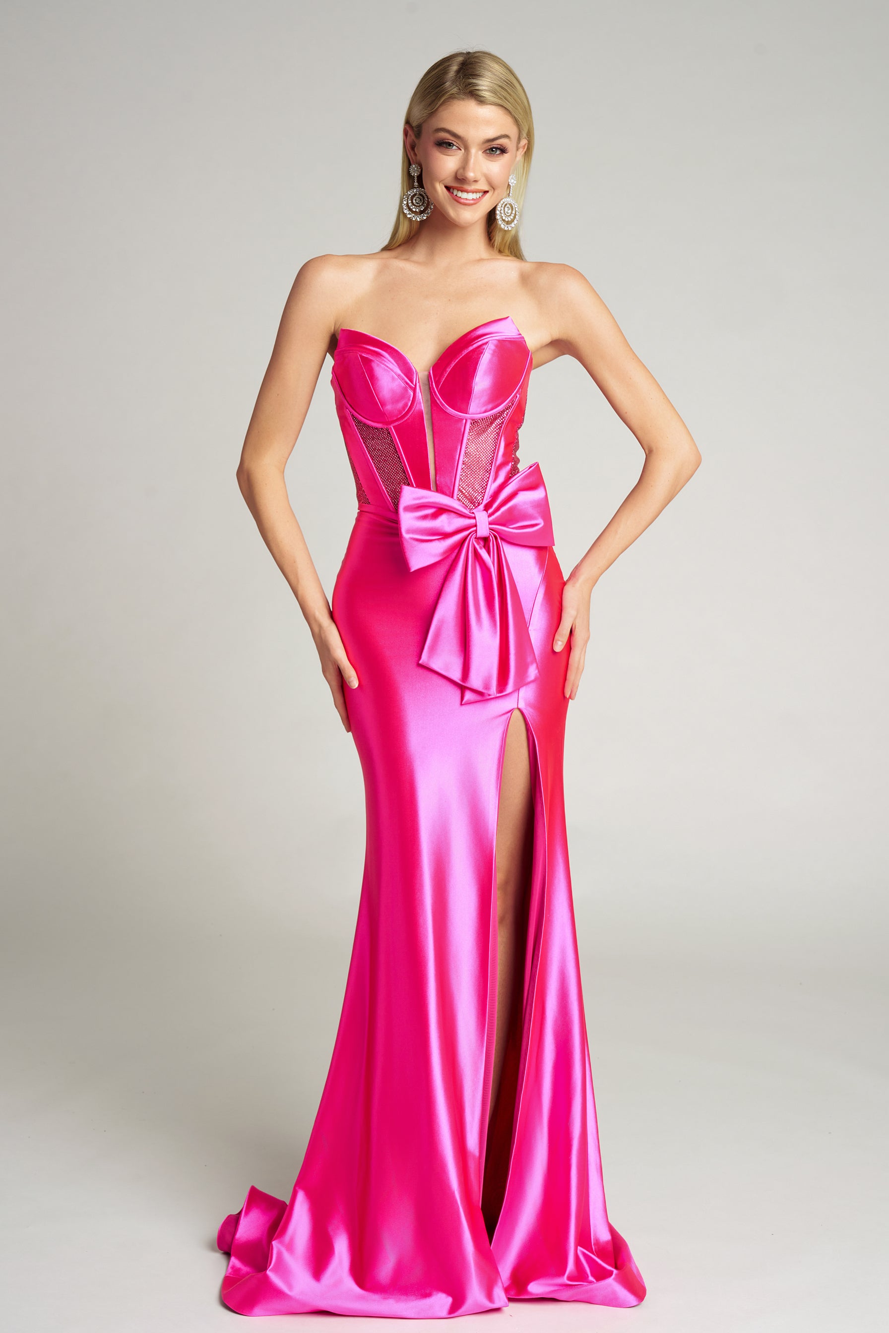 Style PS26136 captures statement-making sophistication with its luminous satin finish and modern structured design. The strapless sweetheart neckline is accentuated by a sheer corset bodice with defined boning that sculpts the waist. A striking oversized bow detail draws attention to the hip, leading into a sleek, high-slit skirt that adds an alluring edge. Effortlessly glamorous, this gown embodies a perfect balance of feminine charm and bold confidence, ideal for red carpet moments and elegant evening affairs.