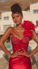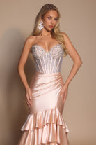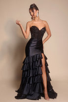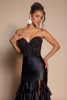 Style PS26141 embodies opulent glamour with a hint of dramatic flair. The strapless corset bodice shimmers with intricate beadwork, sculpting the figure before flowing into a lustrous satin skirt. Cascading ruffle layers and a daring thigh-high slit bring movement and allure, while the removable floral shoulder accent allows for a customizable touch of couture drama.