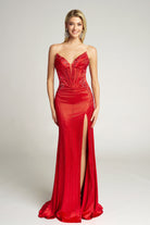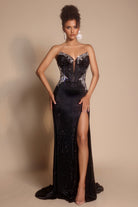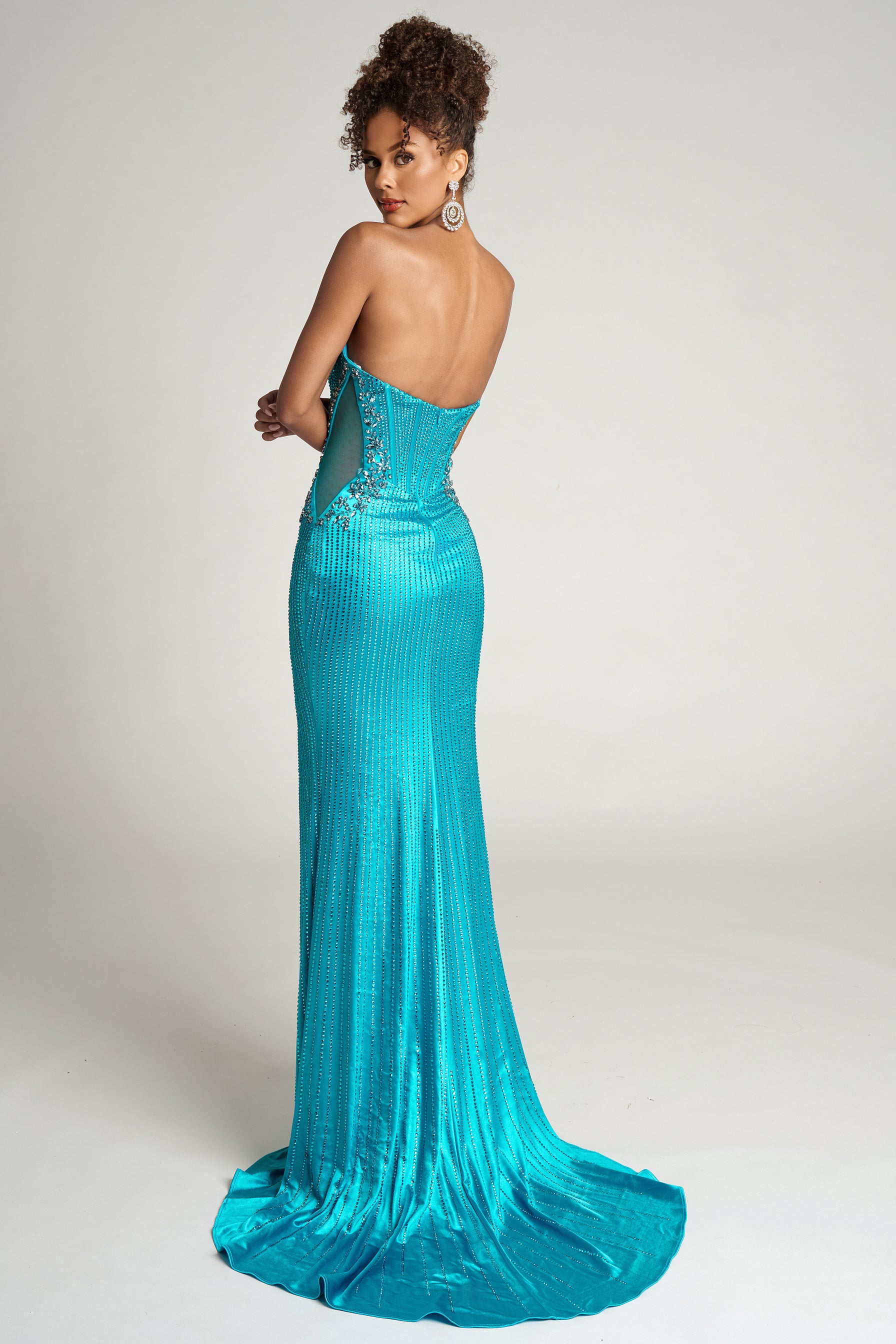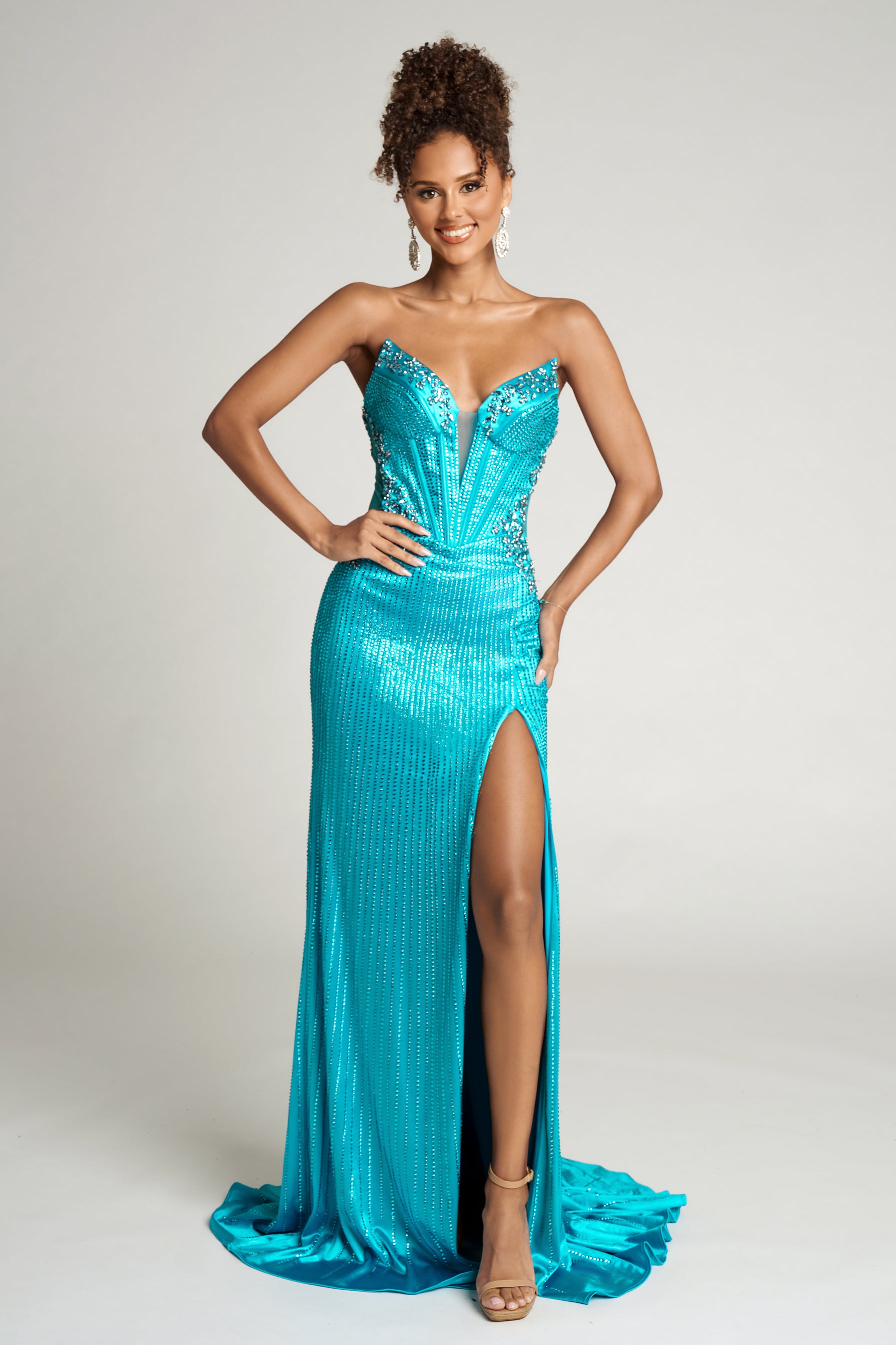 Style PS26147 radiates seductive sophistication and red-carpet allure. The strapless sweetheart neckline is accentuated with glistening embellishments that frame the d?colletage and draw the eye to the sculpted bodice. Precision tailoring creates a sleek hourglass silhouette, while the daring thigh-high slit adds an element of confidence and allure. Crafted in a shimmering, form-fitting fabric that catches the light beautifully, this gown is designed for the woman who commands attention with elegance and poise.