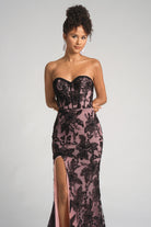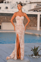 Style PS26175 exudes classic elegance with a modern edge. The strapless gown features an intricate lace overlay adorned with floral applique detailing over a structured corset bodice. The fitted silhouette highlights the figure, while the thigh-high slit and subtle train add a touch of allure and sophistication.