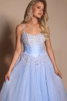 Style PS26208 exudes soft elegance and modern fairytale charm. The gown features a structured corset bodice with delicate beading that flows into a voluminous tulle skirt. Subtle shimmer throughout the design creates a luminous effect.