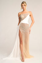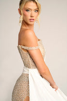 Style PS26318E captures the essence of contemporary sophistication and red-carpet allure. This one-shoulder evening gown features a sheer crystal-encrusted base that shimmers with every movement, overlaid with elegant white draping that wraps the bodice and cascades effortlessly to the floor. The thigh-high slit adds a daring touch, perfectly balancing sensuality and refinement. Detachable off-shoulder sleeves provide versatility, allowing the look to transition seamlessly from modern glamour to timeless elegance.