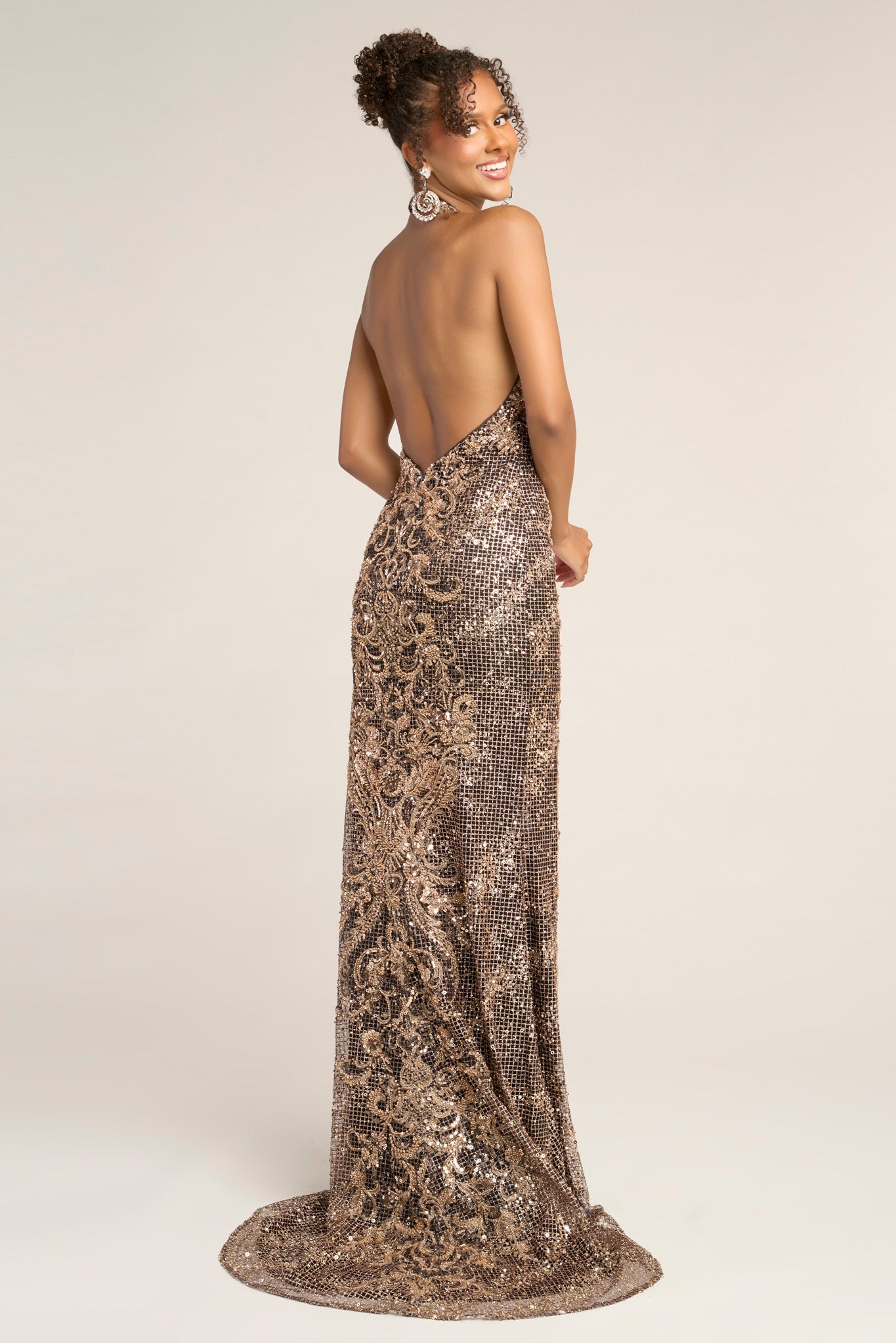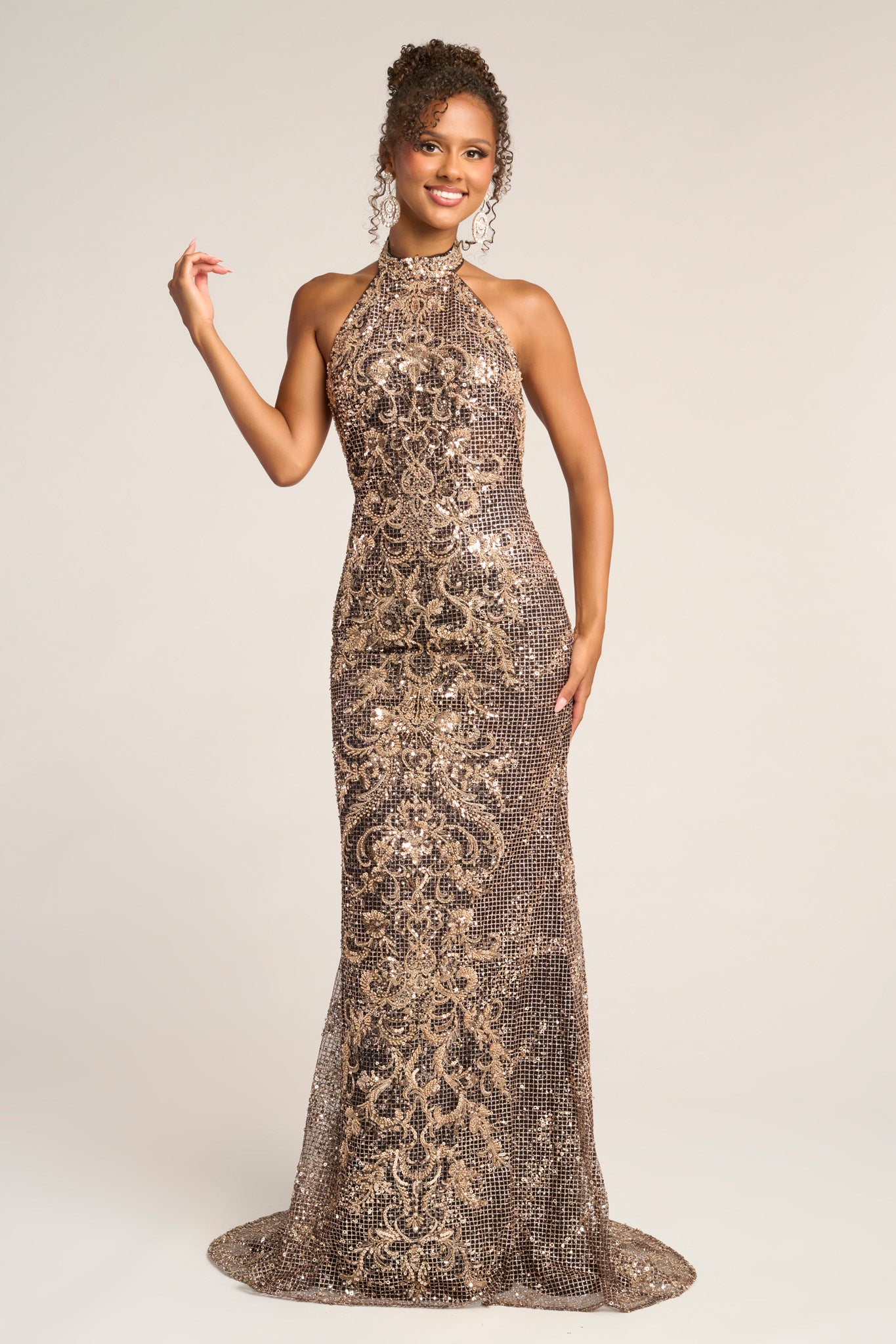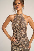 Style PS26324E is a statement of sleek sophistication and timeless glamour. The gown features a high halter neckline that elongates the frame and a figure-hugging silhouette adorned with intricate sequin embellishments that shimmer beautifully with every movement. The open back adds a modern touch of allure, while the subtle sweep train completes the look with effortless grace. Perfect for elegant evening events, this gown is designed for the woman who appreciates refined sparkle and classic elegance.