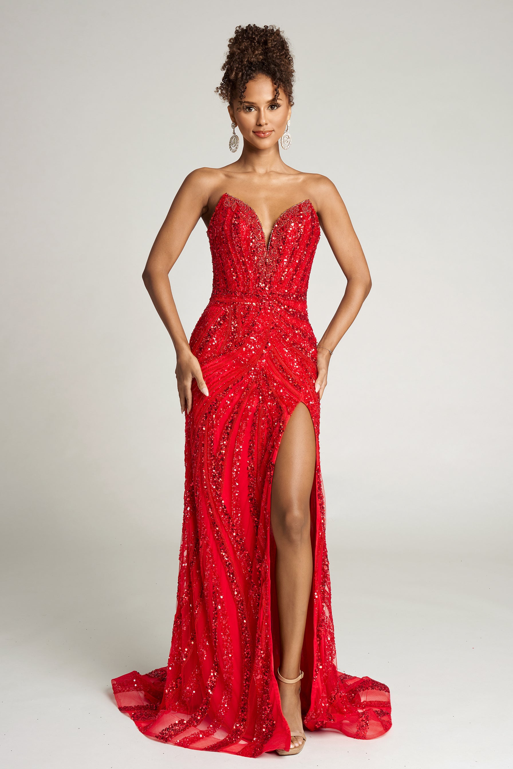 PS26418C is the definition of show-stopping elegance, crafted for the woman who embraces both confidence and sophistication. The gown features a structured sweetheart neckline and corset-style bodice adorned with radiant beadwork that contours the figure to perfection. Intricately placed embellishments create a sculpted illusion effect, enhancing the natural curves while drawing the eye toward the waist. The dramatic thigh-high slit adds a bold touch, complemented by a sweeping train that glides effortlessly with every step. This design captures modern glamour at its finest??efined, radiant, and irresistibly alluring.