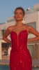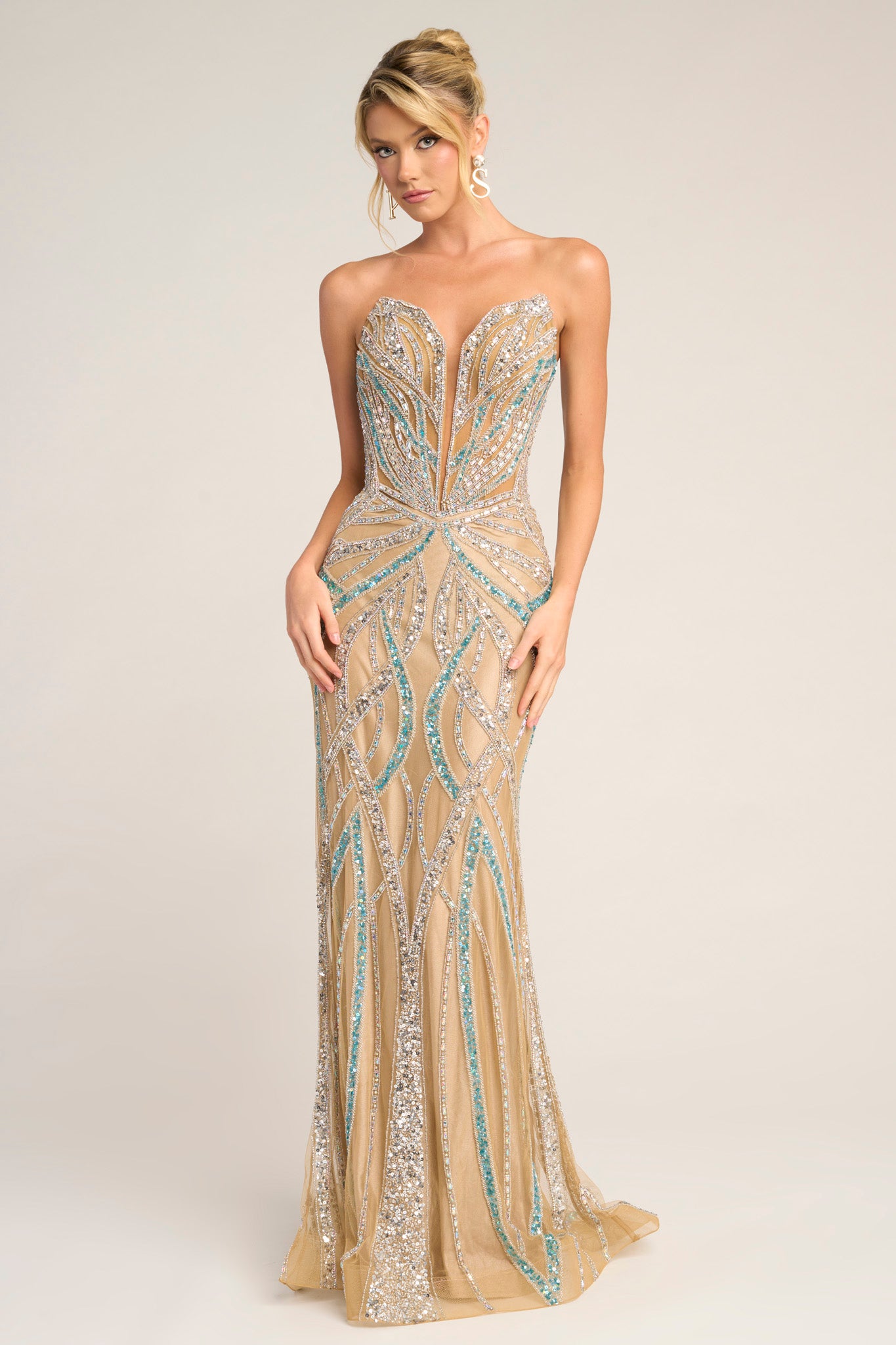 PS26423C is the epitome of bold sophistication, designed to command attention with every detail. This strapless gown features a sculpted plunge neckline accentuated by sheer illusion inset, creating a striking yet refined focal point. The fitted silhouette is embellished with intricate beadwork arranged in a flowing, art-deco-inspired pattern that contours the body and elongates the frame. Crafted from luxurious fabric that shimmers under the light, the gown hugs the figure before flaring slightly into a graceful sweep train. Effortlessly glamorous, this style delivers a perfect balance of drama and elegance for any red-carpet occasion.