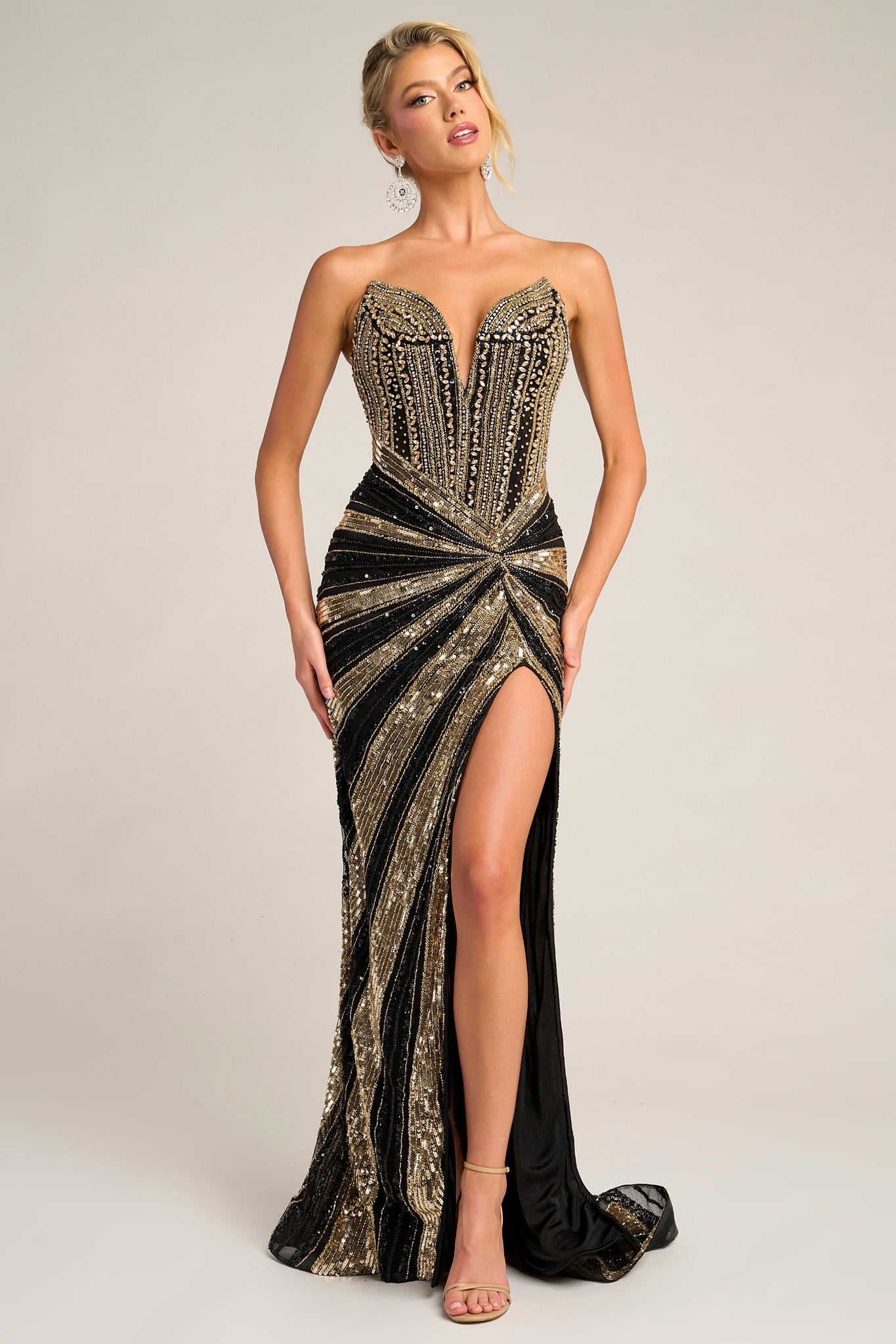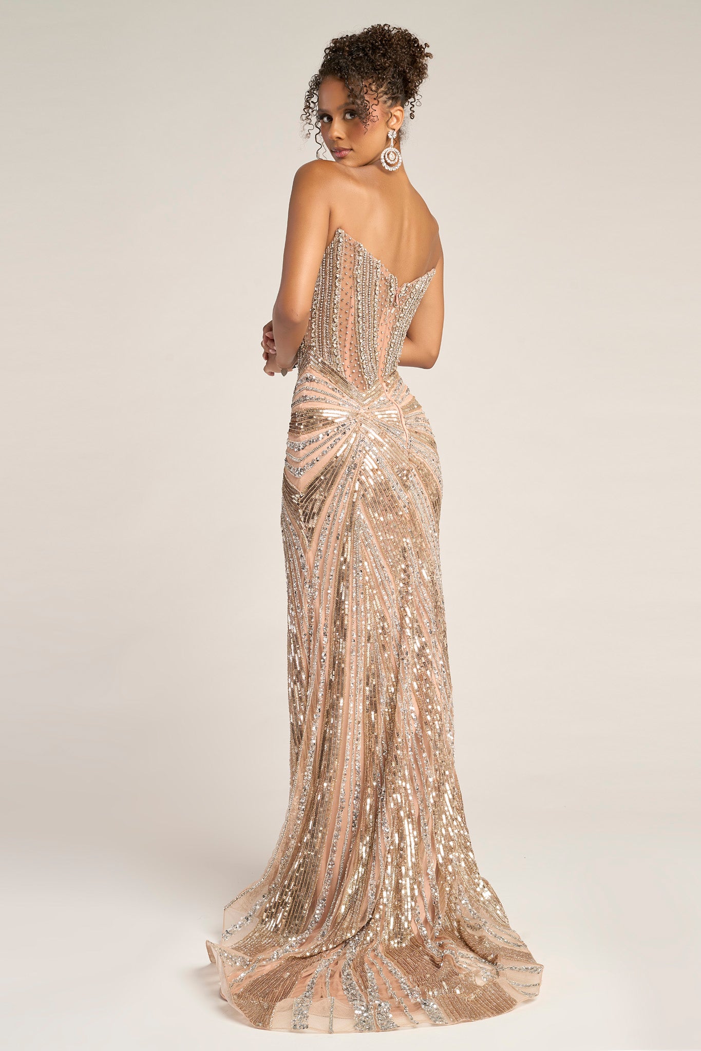 PS26431C radiates high-impact glamour with its sleek, sculpted silhouette and dazzling sequin embellishments. The strapless neckline features a subtle plunge that enhances the d?colletage, while the intricate bead pattern draws the eye toward the waist for a figure-defining effect. A thigh-high slit adds a touch of allure, balancing the gown?? bold shimmer with sophisticated elegance. Perfect for formal occasions where confidence and sophistication take center stage.
