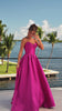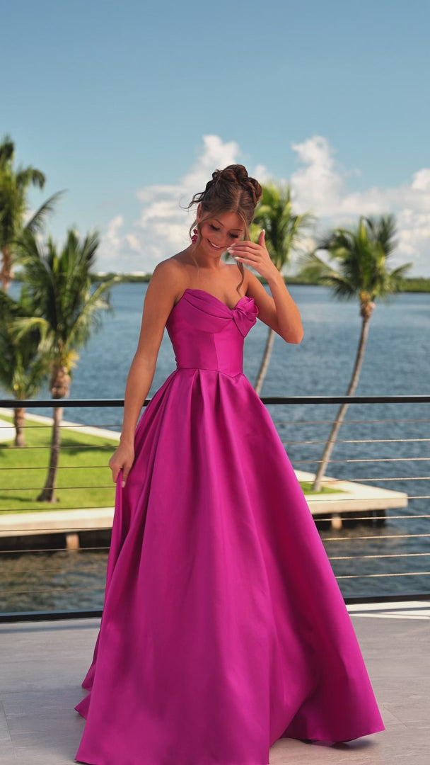 XO110 features a strapless satin bodice with a sweetheart neckline and structured fit. The full A-line skirt flows elegantly from the waist, creating a timeless silhouette. Finished with button detailing along the back, this gown blends simplicity and classic elegance.