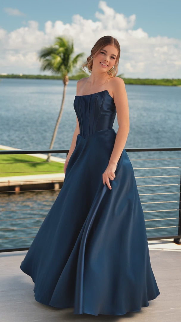 XO119 is a striking gown that blends modern detail with a timeless silhouette. The sheer corset bodice features intricate lace and sequin embellishments, creating a bold contrast against the sleek satin skirt. A thigh-high slit adds a touch of allure, while the ruched detailing at the hip flatters the figure. Finished with delicate straps and a soft train, this gown is perfect for making a statement at any formal event.