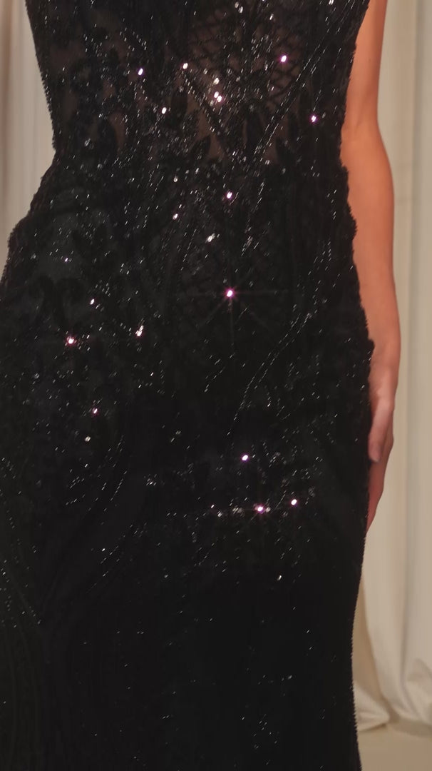 The XO134 gown features a strapless sweetheart neckline with an elegant fitted silhouette, fully detailed with intricate sequin embroidery. The shimmering design highlights the body?? shape before flowing into a subtle flare hem with a small train for a refined finish.