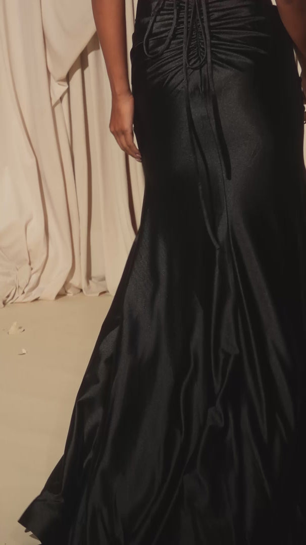 XO168 is a captivating gown that radiates confidence and glamour. The fitted silhouette features a sleek satin finish that drapes beautifully over the body, while the ruched detailing accentuates the waist and hips. The bodice is intricately embellished with tonal beadwork and embroidery, adding rich texture and sparkle. A daring thigh-high slit and lace-up open back complete the look, creating a perfect balance of elegance and allure ??ideal for red-carpet moments or formal evening occasions.