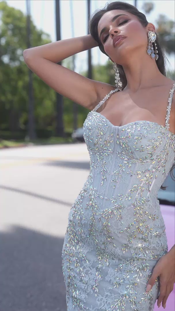 Lace and crystal mermaid gown features a corset bodice, beaded straps, and a trailing train at the back. This dress has medium stretch.
