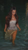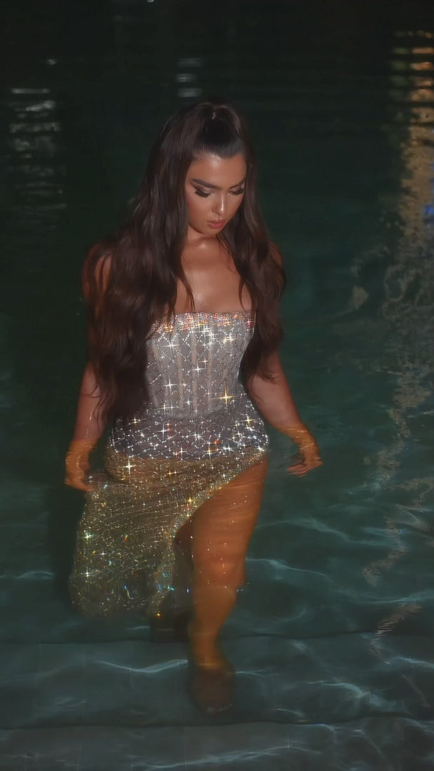 A strapless couture gown, embellished with intricate beading, featuring a defined waist and a side slit. ?This dress has no stretch.