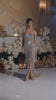 A sleek, fitted couture gown adorned with intricate beading and a striking high slit. ?This dress has no stretch.