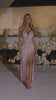 A strapless couture gown embellished with delicate beading, featuring a sweetheart-shaped bodice and a dramatic high slit. This dress has no stretch.