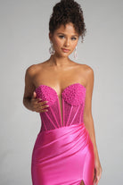 Style PS26039 has a strapless bodice featuring a sculpted corset design with exposed boning and a plunging illusion neckline. Intricately adorned with beadwork across the bust, it creates a dimensional, couture-inspired finish that contrasts beautifully against the smooth stretch fabric. The gown?? draped skirt wraps elegantly around the hips, flowing into a floor-length hem with a high front slit for ease of movement and a touch of modern allure.