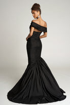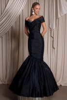 Style PS26320E embodies timeless sophistication and classic glamour. This off-the-shoulder gown features artful ruching throughout the bodice, creating a beautifully contoured silhouette that enhances the natural curves. The fitted design flares into a dramatic mermaid skirt, offering both structure and movement for a statuesque finish. Perfect for evening galas or formal celebrations, this gown captures refined elegance with a modern twist
